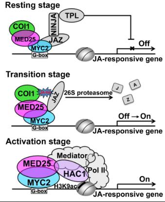 他们的研究发现,在“静息”状态下,MED25通过直接相互作用把COI1招募到核心转录因子MYC2靶标基因的启动子区域;而当活性茉莉酸浓度升高时,MED25促进COI1依赖的对转录抑制子JAZ蛋白的降解。因而无论是在静息状态还是在激活状态下,MED25的作用都有利于MYC2对茉莉酸响应基因的转录调控。这些结果同时表明茉莉酸信号的识别实际发生在MYC2的靶标启动子区域。