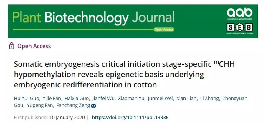 2020年1月10日,山东农业大学作物生物学国家重点实验室/农学院教授、博士生导师曾范昌课题组,在国际生物技术著名期刊《Plant Biotechnology Journal》(植物科学一区Top期刊,最新即时IF>8)在线发表了题为“Somatic embryogenesis critical initiation stage-specific mCHH hypomethylation reveals epigenetic basis underlying embryogenic redifferentiation in cotton”的最新研究进展。该研究成果为作物高效细胞工程与无性育种提供最新理论依据,同时具有重要应用价值。